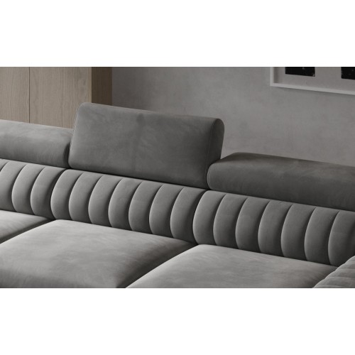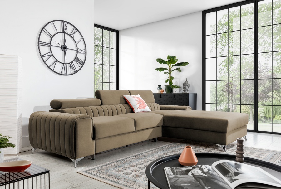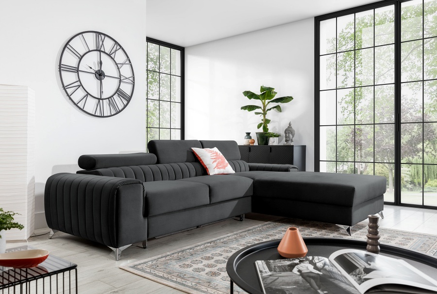 This model not only has a contoured backrest and movable, adjustable headrests, but also a unique, modern look. Only you can decide whether you want to enliven your living room with warm shades of colour saturation, or tone down your interior and contrasting furnishings with delicate shades of beige and grey upholstery. The 9 cm steel legs also add to the unique charm of GRAYS. This piece of furniture is a class of its own and a substitute of luxury in its pure form, which is simply available to everyone. Apart from its unusual design, it is also distinguished by maximum comfort. The seat is made of, among other things, reliable T30+HR foam, which increases its flexibility and resilience. No dents, no scratches, but maximum comfort. If daytime relaxation is not enough - use GRAYS to relax at night as well! Thanks to its intuitive dolphin mechanism, transforming the sofa into a 125 x 210 cm sleeping area is simple and trouble-free. The generously sized bedding compartment is an added convenience. Don't rub your eyes in amazement, and check and test our GRAYS corner sofa for yourself.