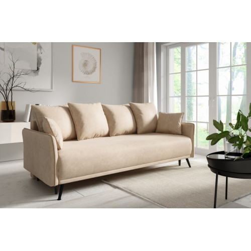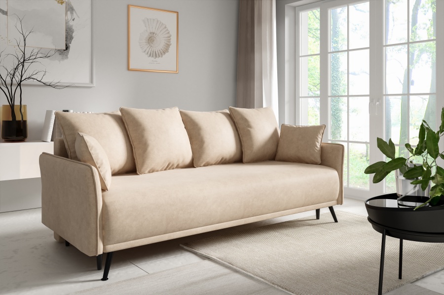 Lazio sofa is an elegant and functional piece of furniture ideal for modern interiors. Thanks to the DL folding system, it easily transforms into a comfortable bed, and the bedding container offers practical storage space. Equipped with four large pillows with decorative piping and two smaller pillows, it provides exceptional comfort. Piped sides and industrial legs emphasize its modern style.