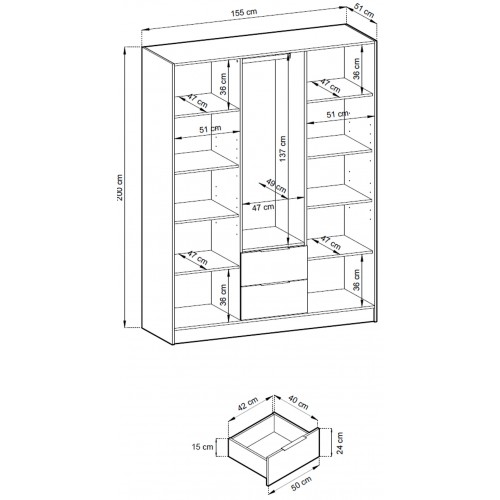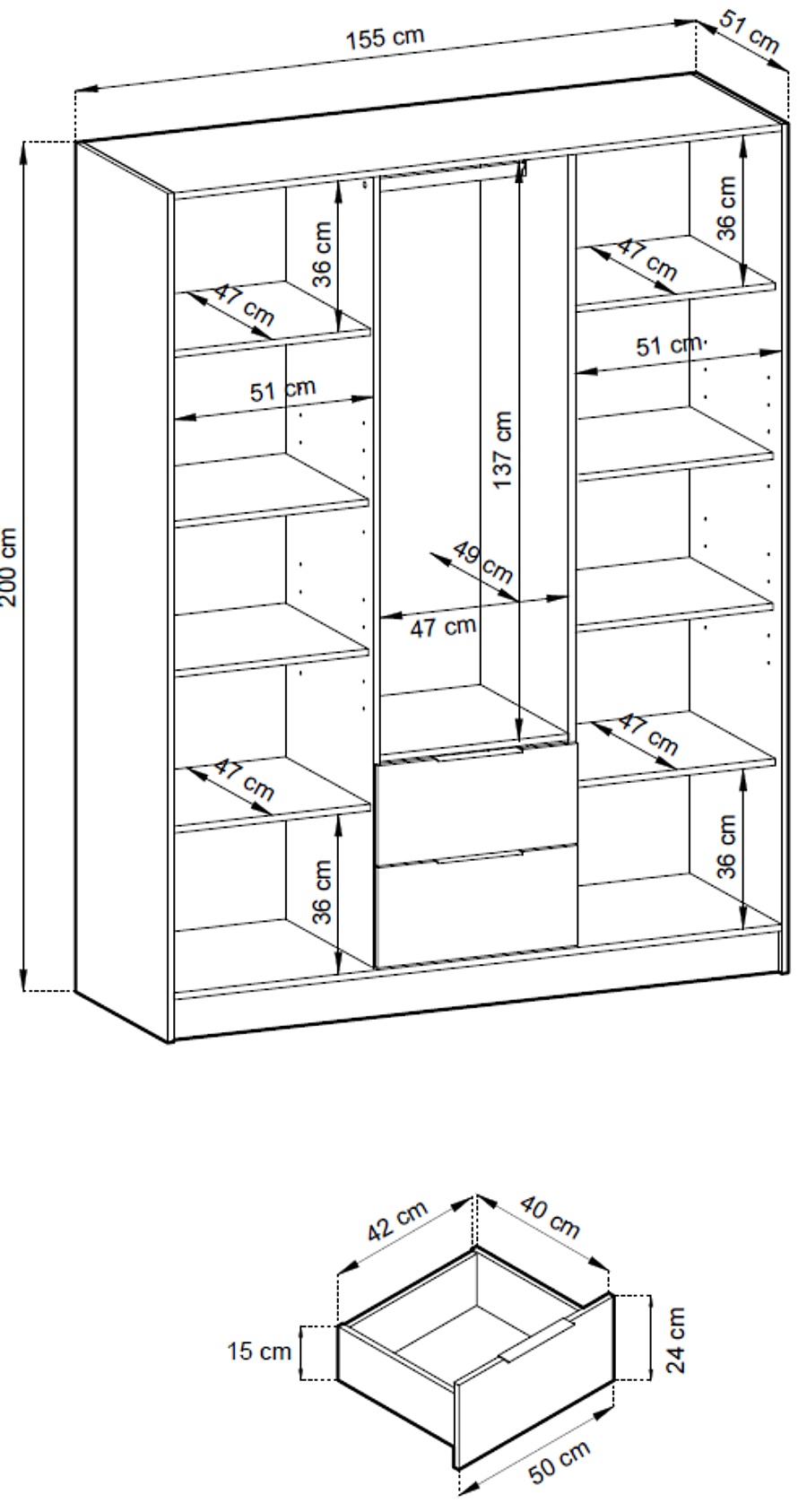 Additionally, there's a convenient mirror on the center doors, two spacious drawers, and a clothing rod, making this wardrobe fulfill all your needs.