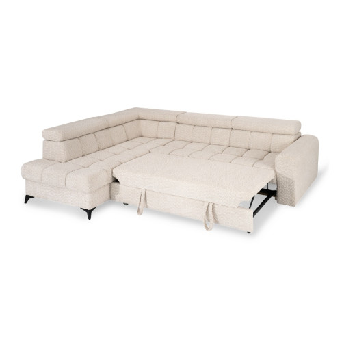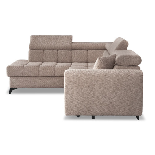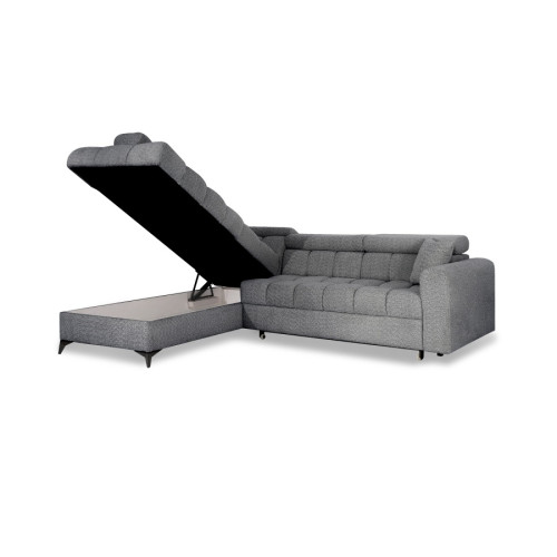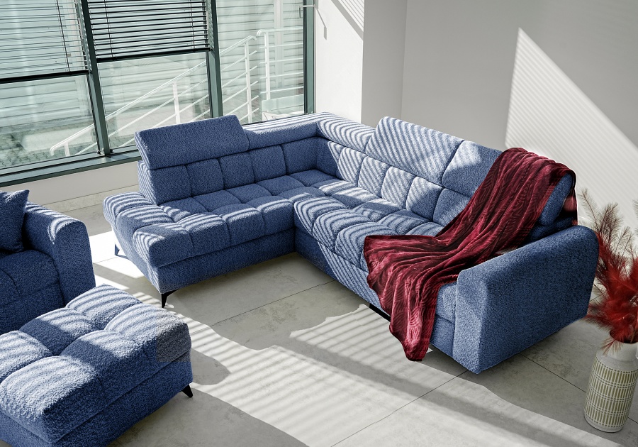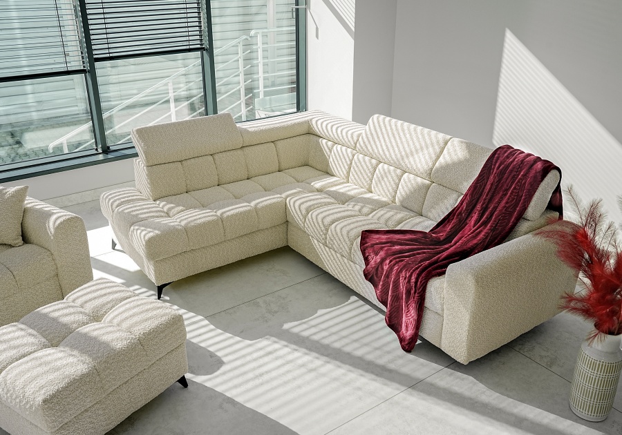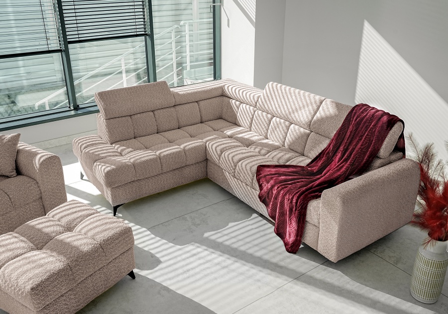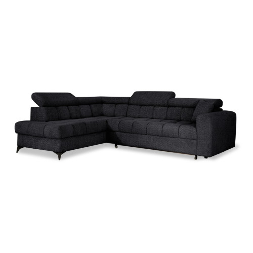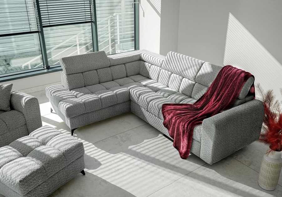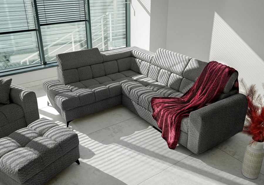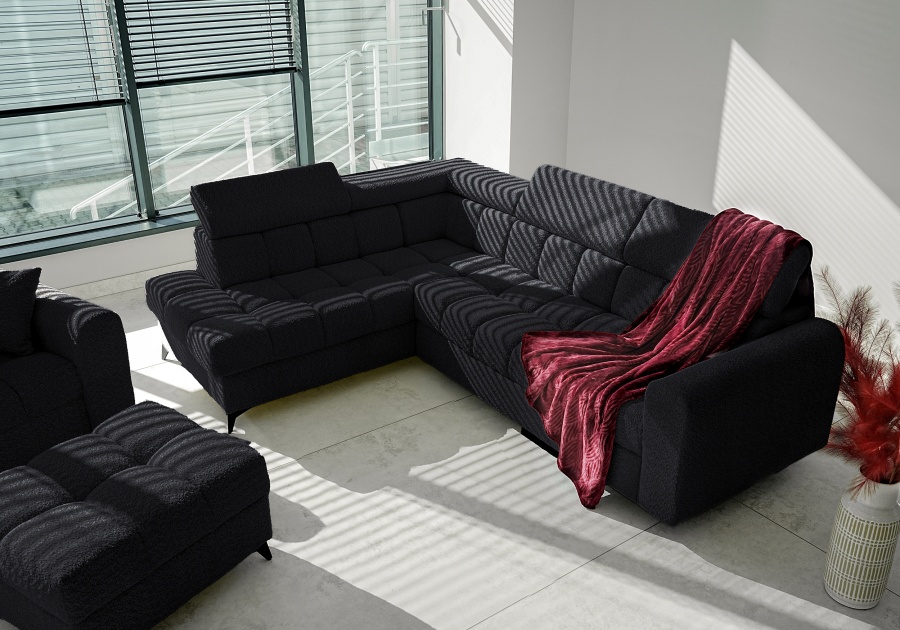 The CAPRIO corner sofa bed stands out with its modern design and stylish look, which fits perfectly into contemporary interiors. The slender black legs give it a light, airy feel and emphasize the piece’s modern character. Adjustable headrests ensure comfort.