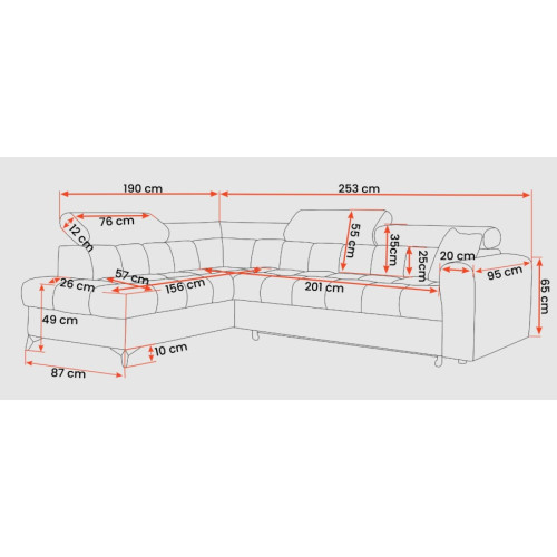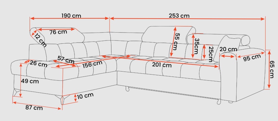 The corner sofa features a 202×127 cm sleeping surface and a practical storage compartment for bedding. When unfolded, the sleeping surface is upholstered in the same fabric as the corner sofa. The back of the sofa is also covered in fabric, allowing it to be placed anywhere in the room.
