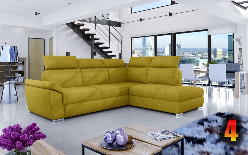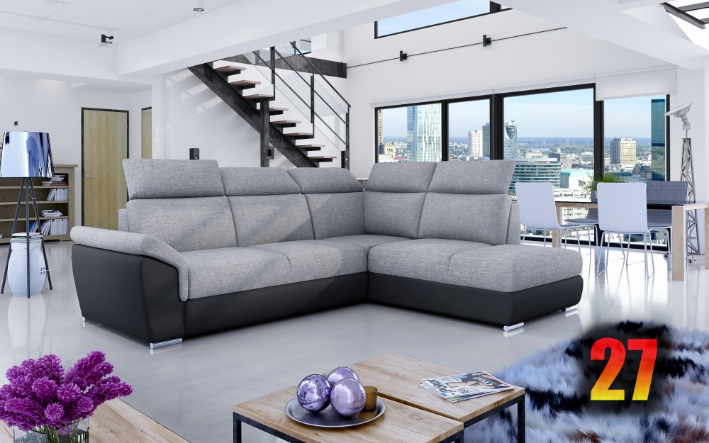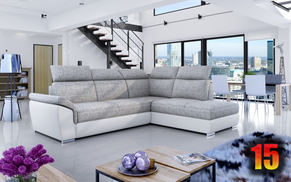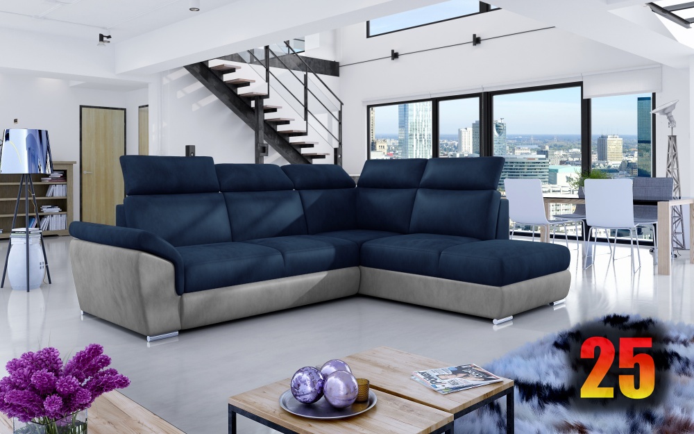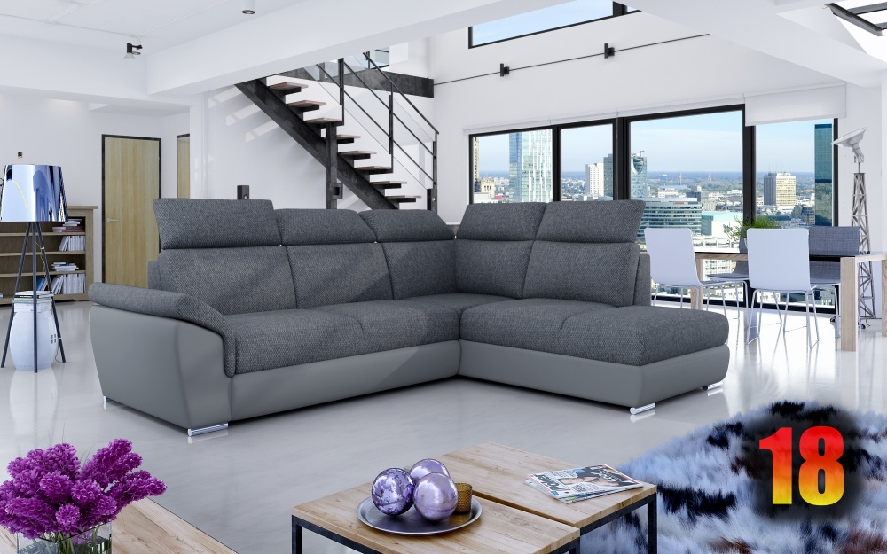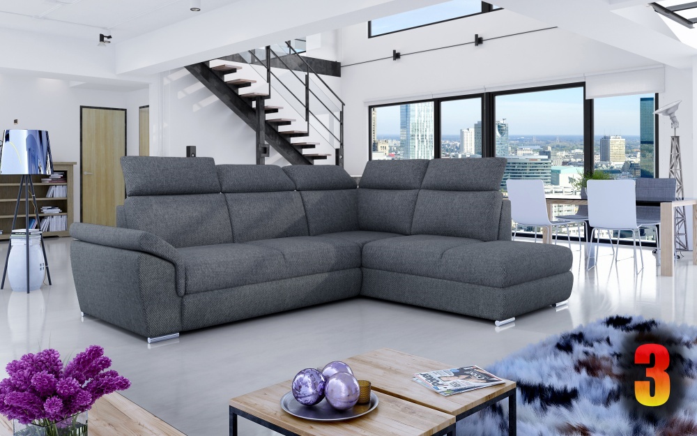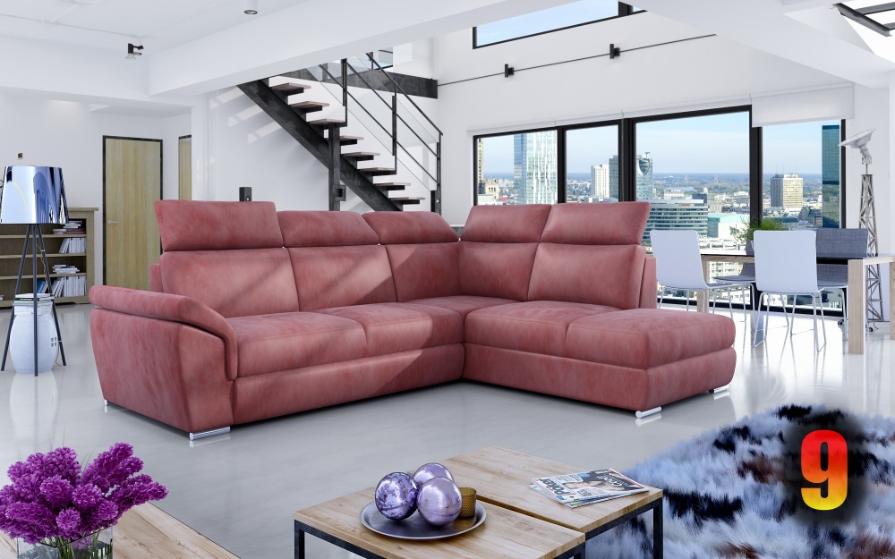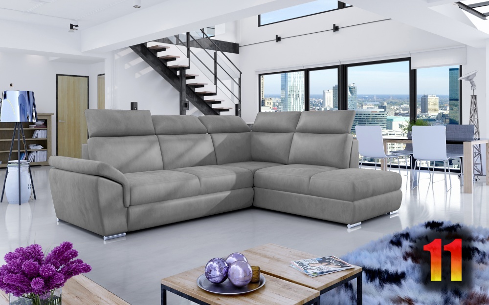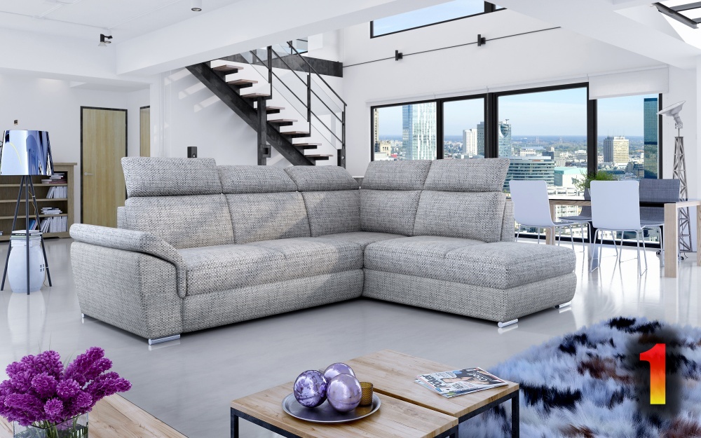 Proper profiling and five multi-stage adjustable headrests properly support the head while relaxing, protecting the spine. The corner sofa is equally suitable as a lounge furniture during the day and a place to sleep at night. All this is due to the option of unfolding in the dolphin system (a trolley that slides out from under the seat, on which we pull up the mattress lying on it), which makes it possible to have a resting place with the dimensions of 125x190. The generously sized bed linen box located in the ottoman and supported by a spring automatic allows you to keep everything tidy after folding the bed. A wide range of colours and upholstery models makes it easy to match this piece of furniture to your preferences and general interior design.