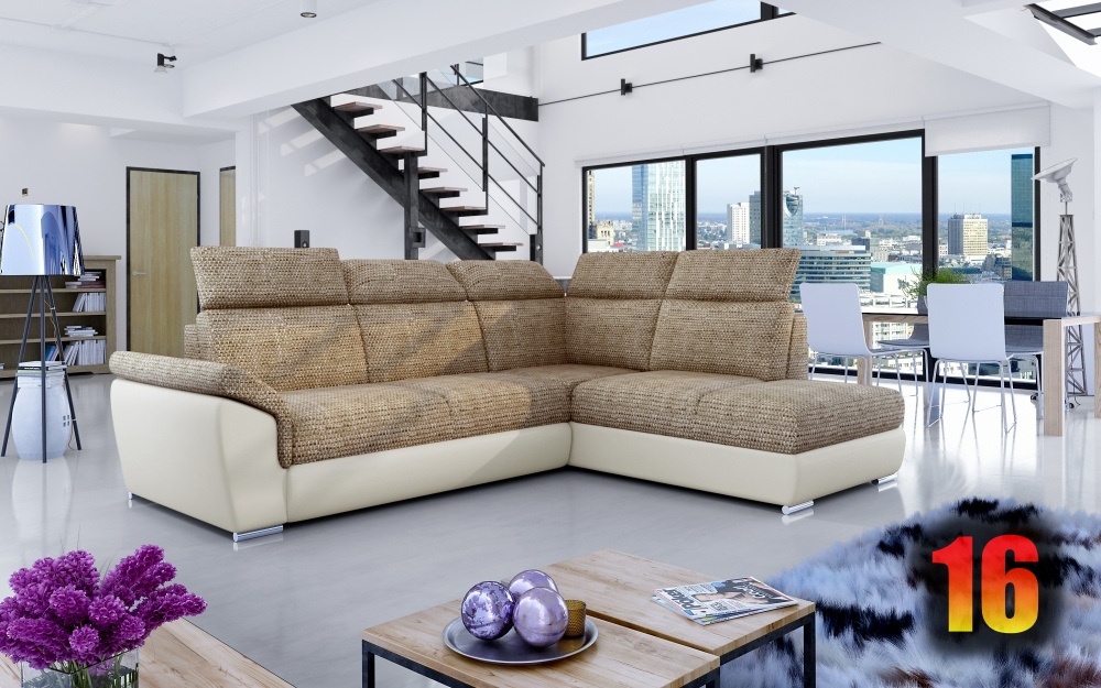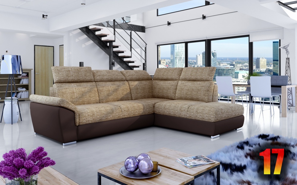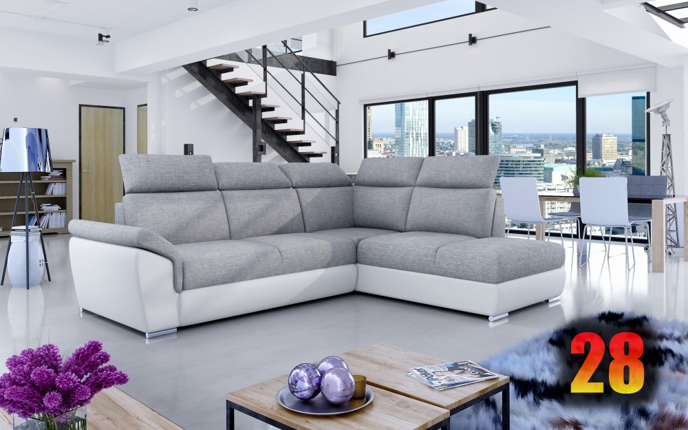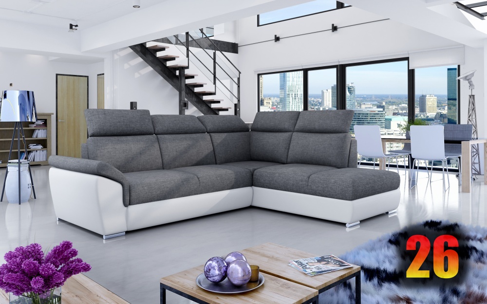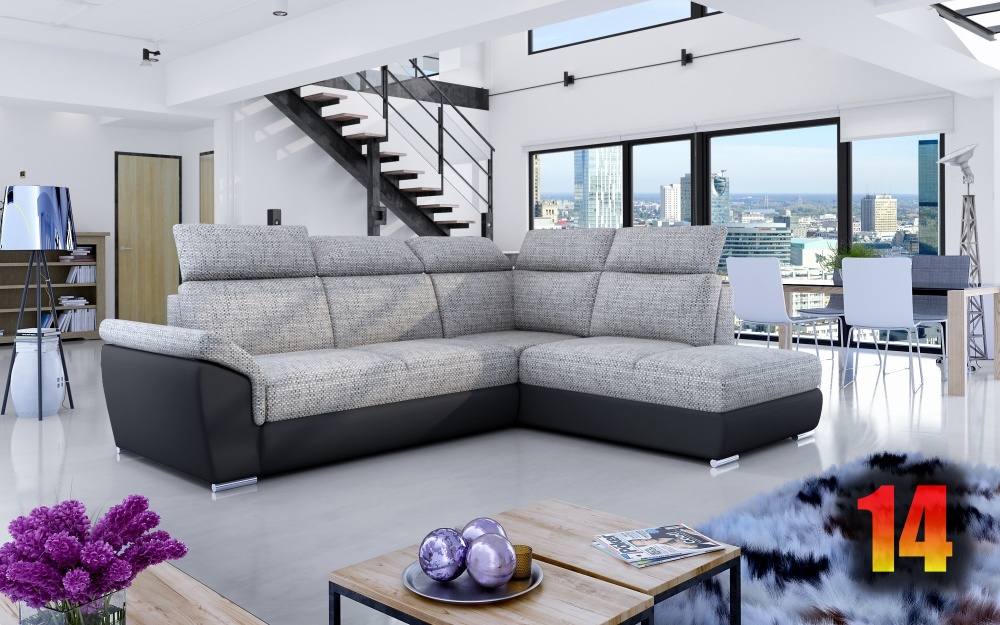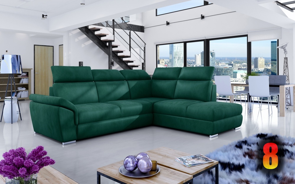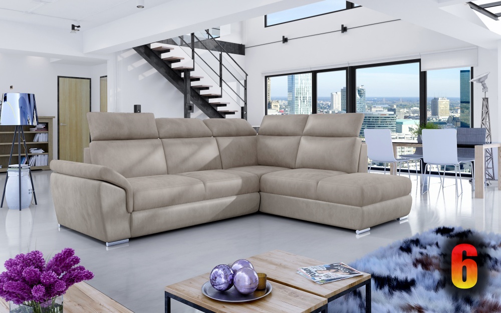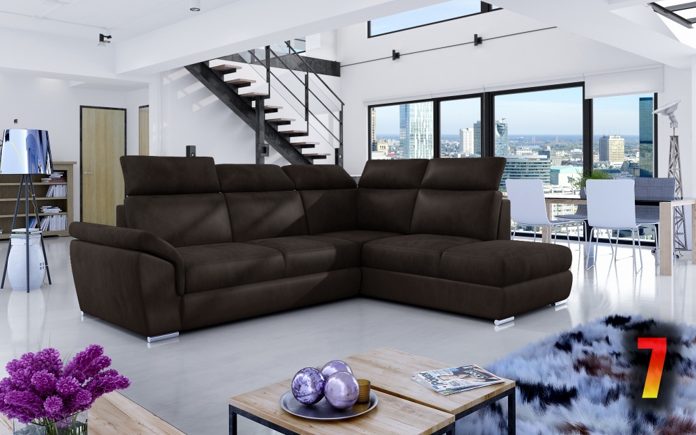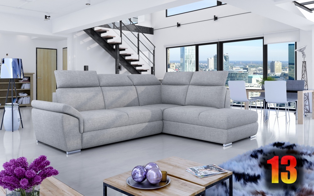 Proper profiling and five multi-stage adjustable headrests properly support the head while relaxing, protecting the spine. The corner sofa is equally suitable as a lounge furniture during the day and a place to sleep at night. All this is due to the option of unfolding in the dolphin system (a trolley that slides out from under the seat, on which we pull up the mattress lying on it), which makes it possible to have a resting place with the dimensions of 125x190. The generously sized bed linen box located in the ottoman and supported by a spring automatic allows you to keep everything tidy after folding the bed. A wide range of colours and upholstery models makes it easy to match this piece of furniture to your preferences and general interior design.