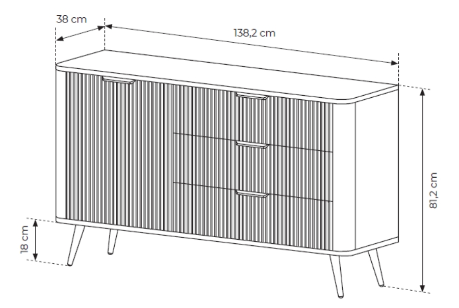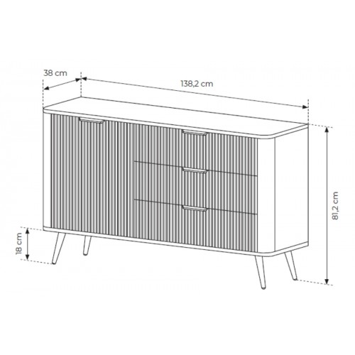The LANTE set is a combination of elegance and class with modernity and originality. The collection owes its unusual character to interesting, grooved MDF fronts, as well as rounded edges, subtle handles and slender, rolled legs, adding visual lightness to the arrangement. The bookcase has a black or beige HDF board with a wood structure. The whole thing will add elegance to your living room and bring a touch of modernity.