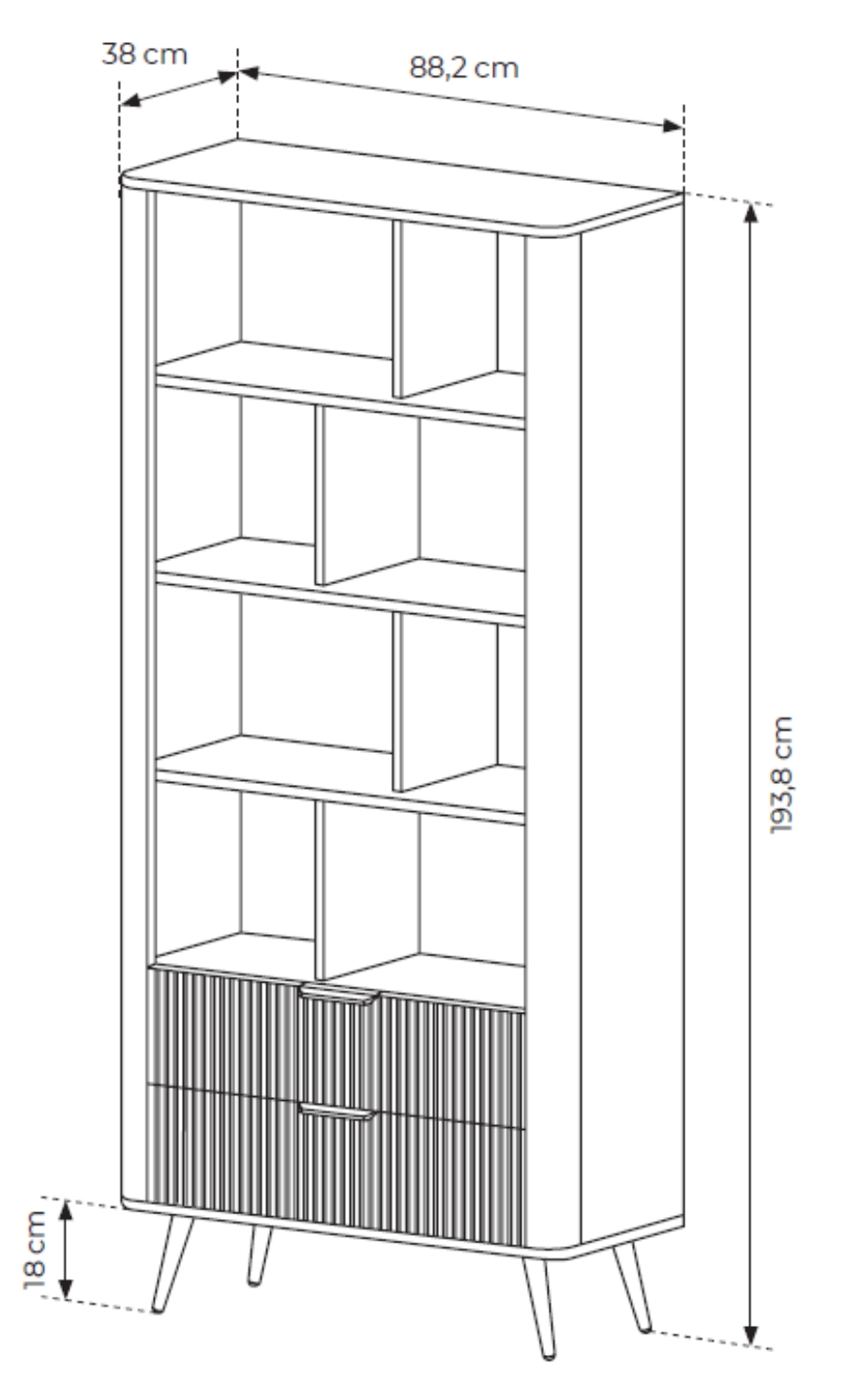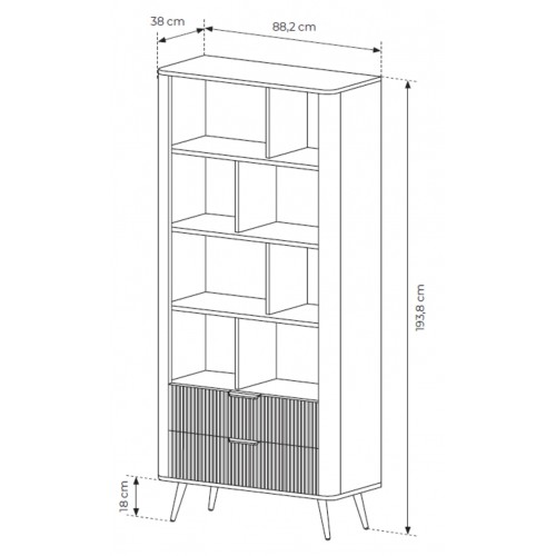 The collection owes its unusual character to interesting, grooved MDF fronts, as well as rounded edges, subtle handles and slender, rolled legs, adding visual lightness to the arrangement. The bookcase has a black or beige HDF board with a wood structure.