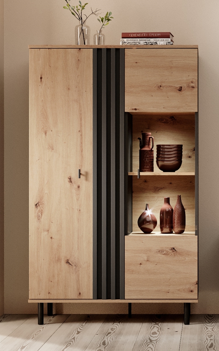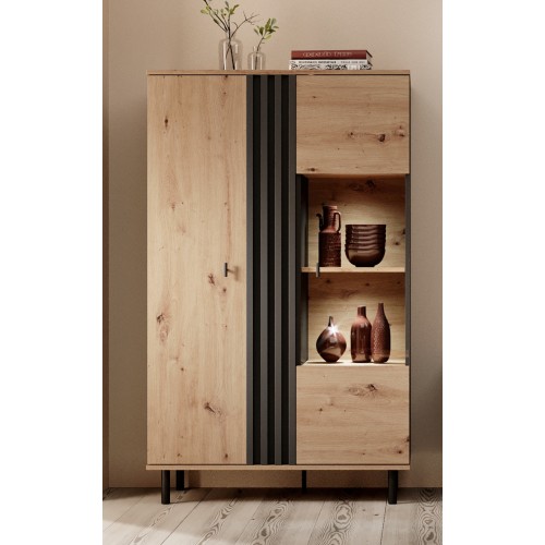 MADIS is a set in the fashionable colors of natural oak, combined with contrasting anthracite. The subtle use of lamellas is in line with modern design trends and emphasizes the character of the solids. Custom handles mounted vertically and black metal legs give the furniture a lightness. The collection is designed for anyone looking for an unconventional design, which will give the interior an amazing, original look.
