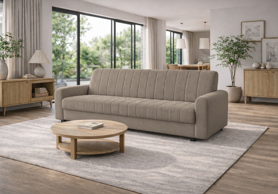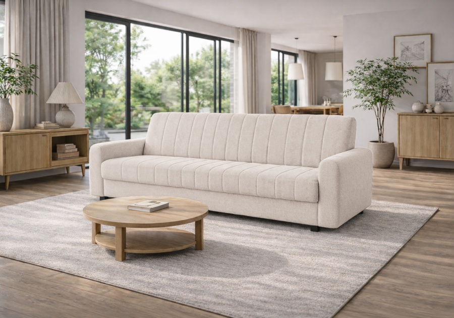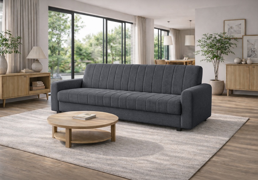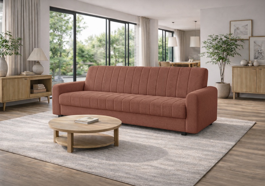 Pixi is a modern sofa with a simple, elegant design, distinguished by vertical stitching on the backrest and seat, which give it a stylish look. Wide, rounded armrests ensure comfort, and the whole piece, set on low legs, fits perfectly into contemporary interiors. Upholstered in a durable and soft-to-the-touch fabric, it is ideal for the living room.