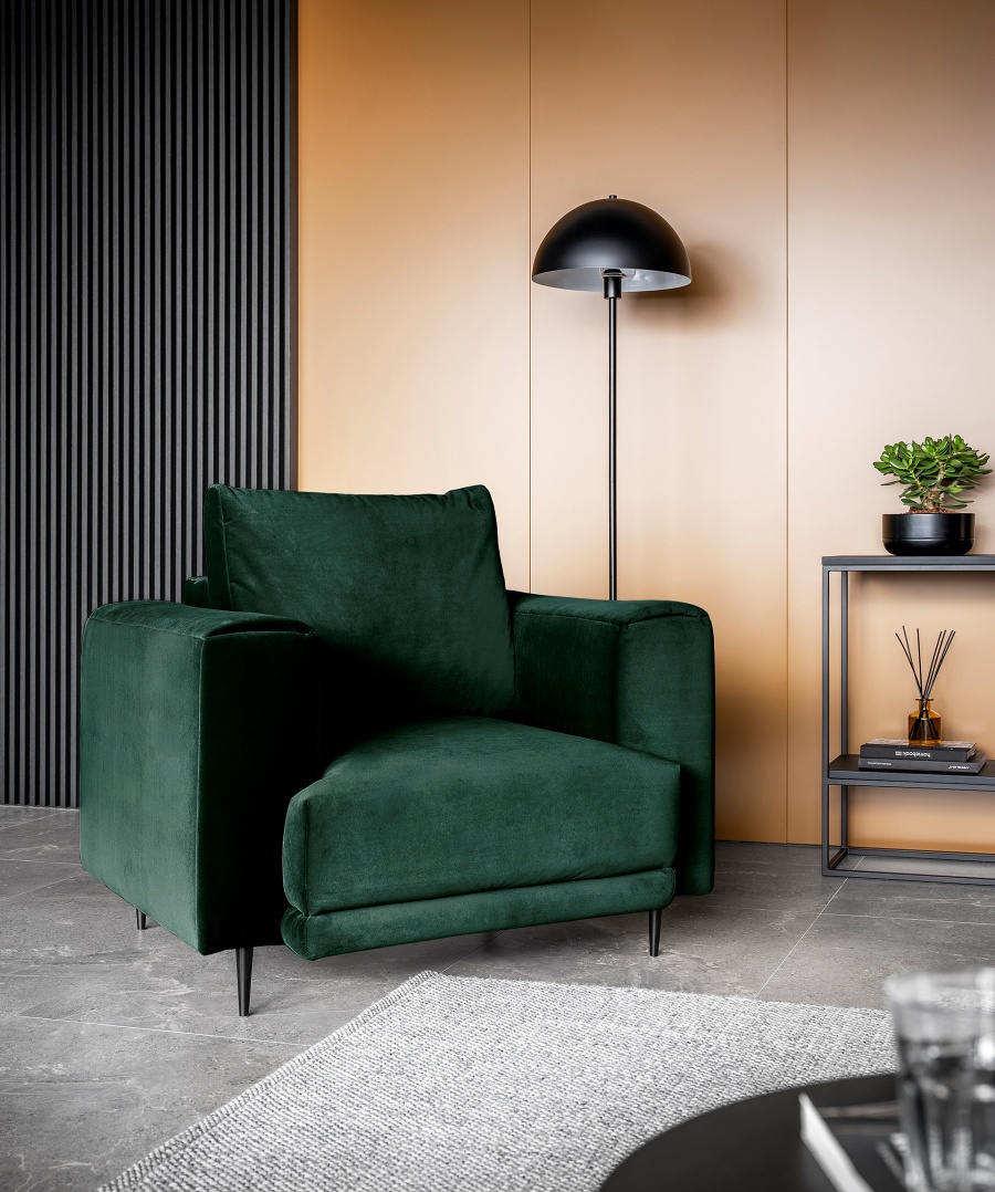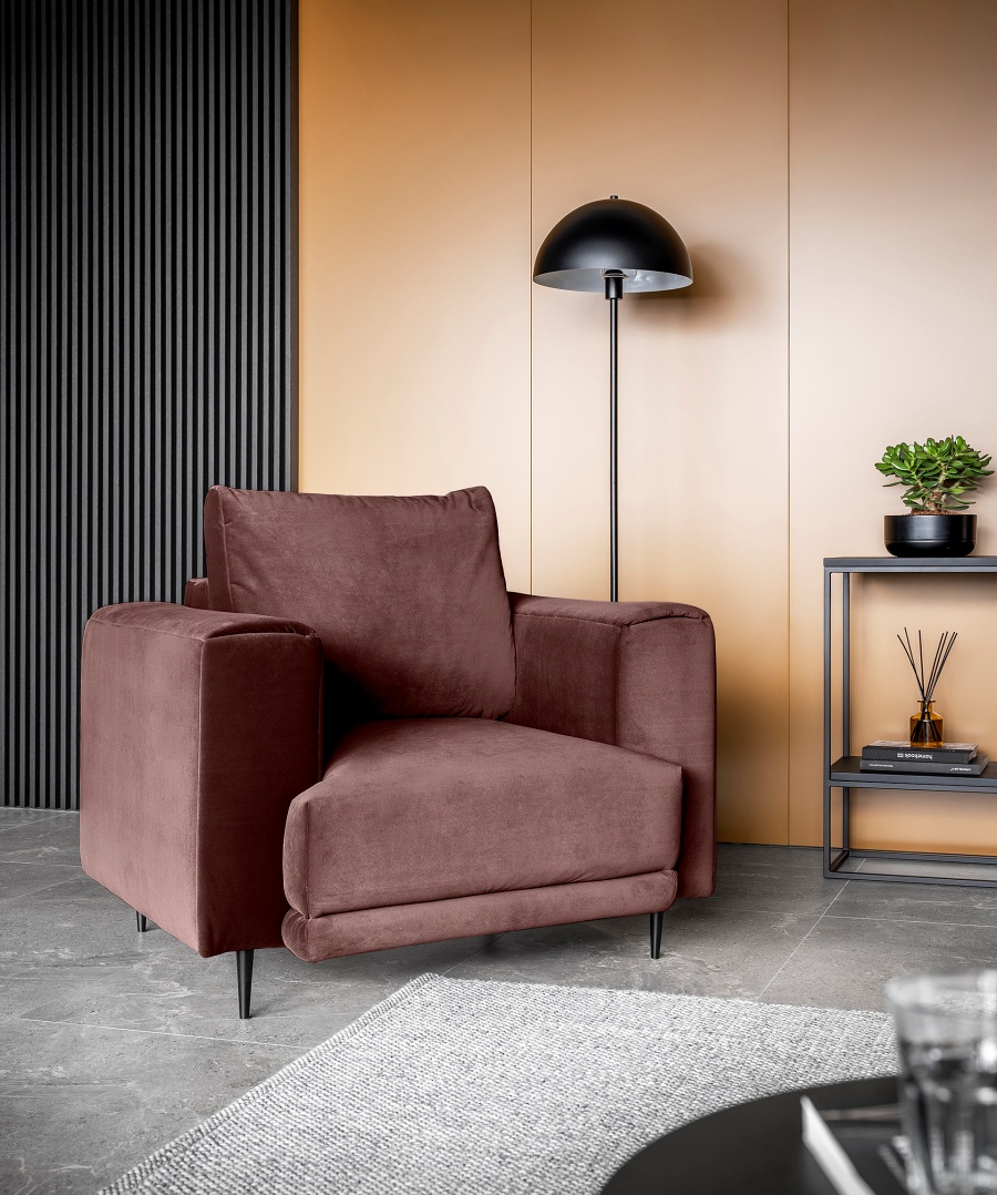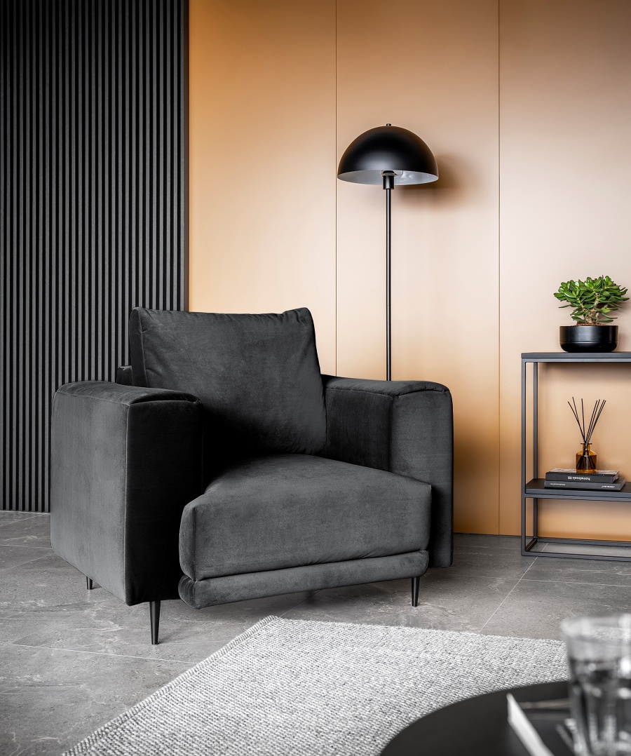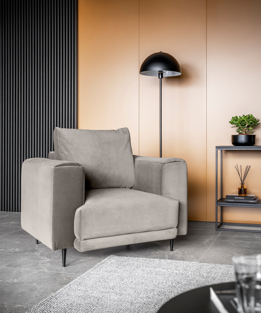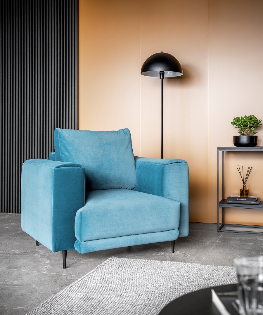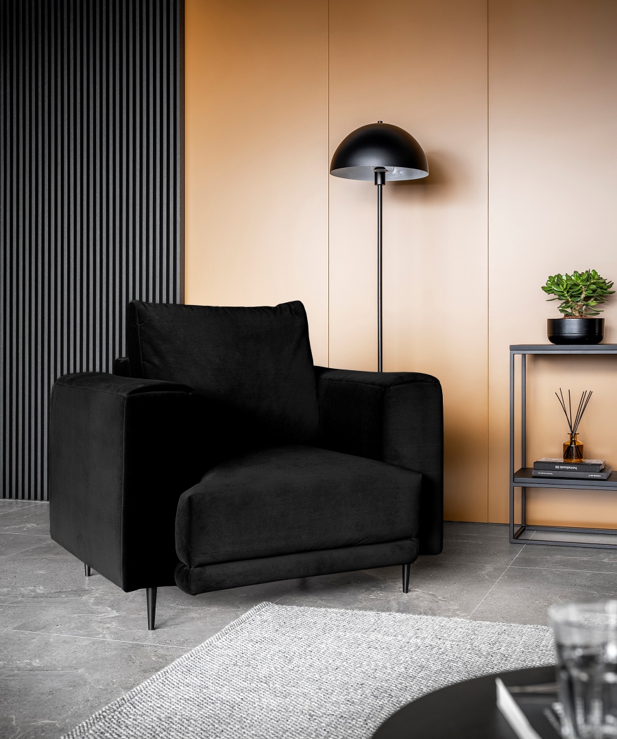 The Dalia armchair brings not only extra seating to a space, but also traditional style. This piece of furniture is a fresh take on the classic look of room armchairs. The high 13-centimetre legs make it possible to use cleaning robots without worrying about missing a section of the floor under the furniture. The Dalia armchair is built on four, black, tapering legs made of metal and its frame is striking in a discreet silhouette full of classic charm. The armchair is upholstered in a fabric of your choice and the back cushion is filled with foam granules to provide support while sitting. The seat of the Dalia armchair is a combination of highly-flexible and damage-resistant HR foam and type B corrugated spring. Such a mixture gives long life to the armchair and makes it really comfortable and convenient.
